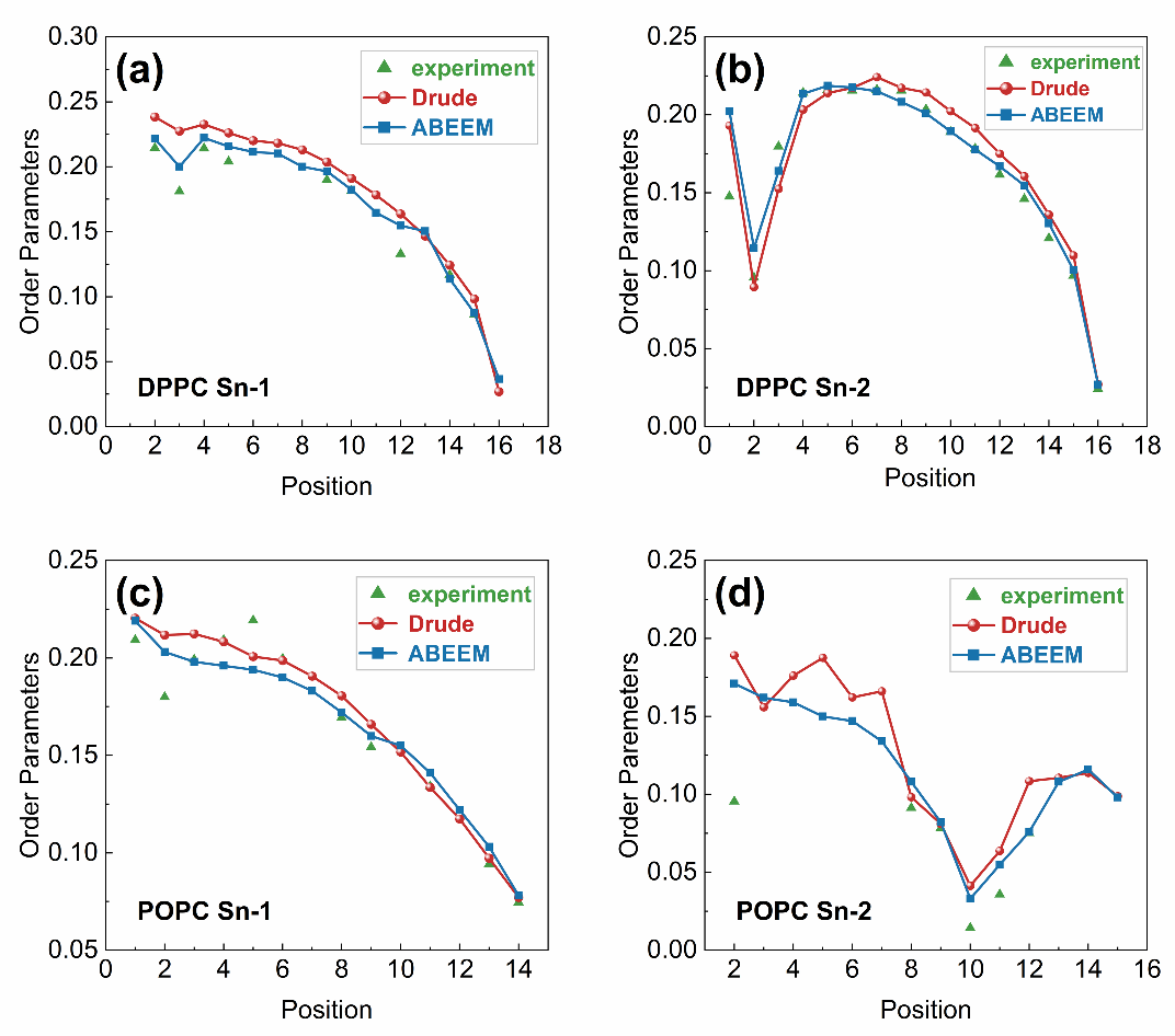 Figure2(原文Figure 9)为DPPC和POPC脂双层分子动力学模拟结果中的碳原子的SCD值,该数值代表整个尾链上的氘序列参数的趋势,通常表现为从甘油主链到末端甲基的递减趋势,主要归因于分子链上构象无序的逐渐增加。Drude和ABEEM PFF模拟均观察到最低的SCD值出现在离体系疏水核心最近的碳原子上,复现了氘序列参数的下降趋势,并且ABEEM PFF的结果稍优于Drude力场的计算结果。