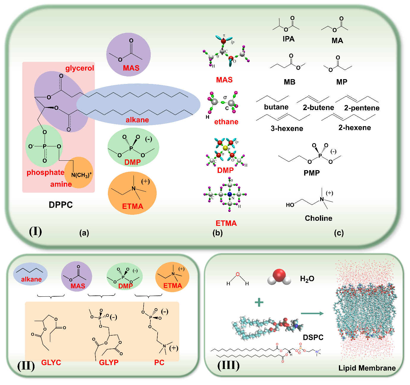 针对前述挑战,基于课题组多年来创立和发展的原子-键电负性均衡浮动电荷力场模型(ABEEM PFF),宫利东教授团队构建了磷脂酰胆碱(PC)类脂质分子的浮动电荷可极化力场,为高精度模拟脂质双层体系提供了一种新方法。在参数化策略上,作者采用分层递进式研究流程:首先选取代表脂质不同官能团的小分子体系,以高水平量子化学计算结果为基准调节力场参数;随后将优化后的参数应用于界面处模型分子以及脂质分子;最终应用于PC类脂质双分子层体系的分子动力学模拟。